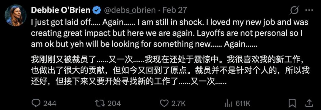 这已经是Debbie在短短几个月内,继微软之后遭遇的第二次裁员了。